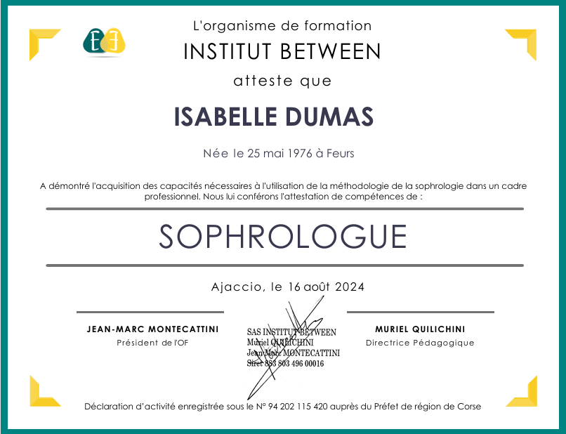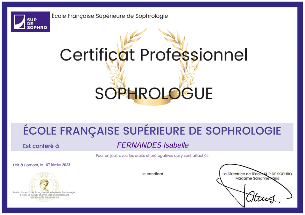 Avec cette deuxième formation, j’ai pu obtenir le titre RNCP (reconnaissance officielle du métier de sophrologue).